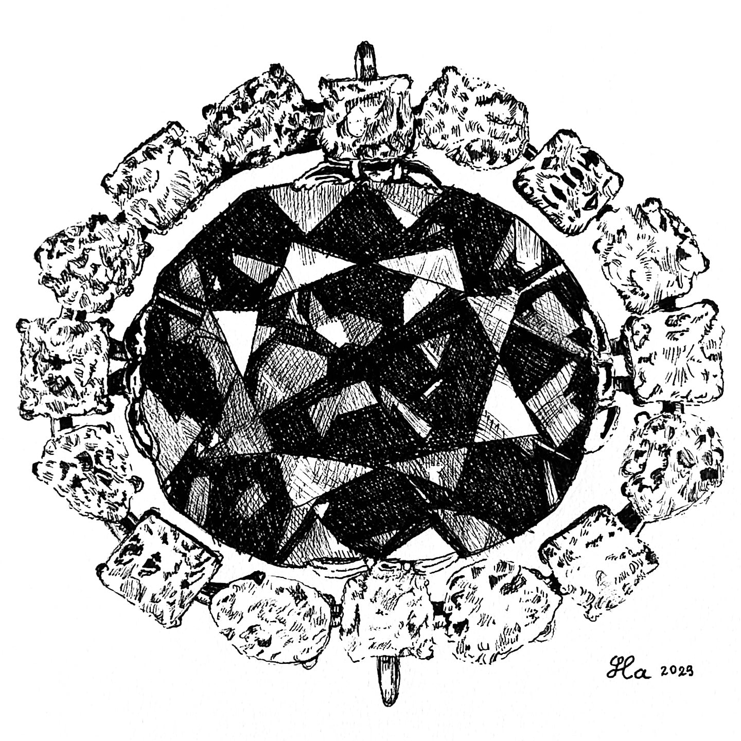 Este dibujo esta inspirado en el Diamante Hope, también conocido como el "Diamante Azul de la Corona", que fue robado el 11 de septiembre de 1792 durante la Revolución Francesa en el Palacio de las Tullerías en París. Este diamante de 45.52 quilates, originalmente parte de la corona francesa y representó la pérdida de riqueza y poder de la monarquía y la aristocracia en medio de la agitación política.