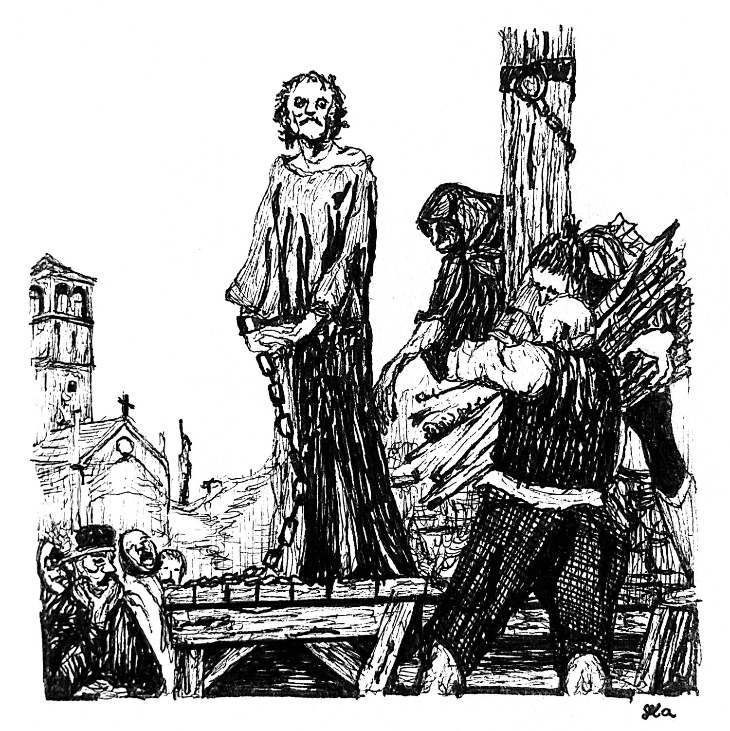 This drawing is inspired by the date on which Giordano Bruno, the philosopher who defied the Inquisition, was executed, on February 17, 1600.